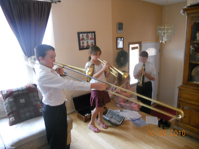 Jon's trumpet has had a rubber band holding on one of the valves even since Mike played the instrument in high school. Yesterday, Jon and I took the horn to the music store and it was a five dollar fix. Jon's been playing the trumpet since 5th grade and it only needed a 5 dollar spring!